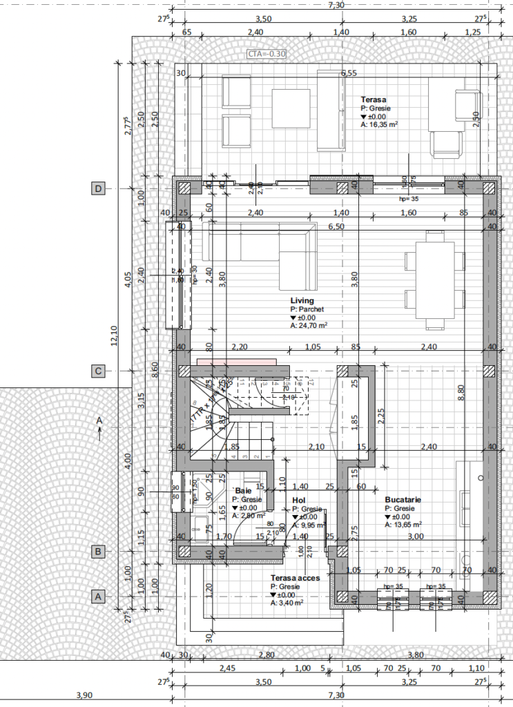 – living generos de tip open-space, cu suprafețe vitrate generoase pentru a beneficia de cât mai multă lumină naturală, în suprafață de 24,70 mp, care include și zona de dining și ieșire pe terasa din spatele casei;