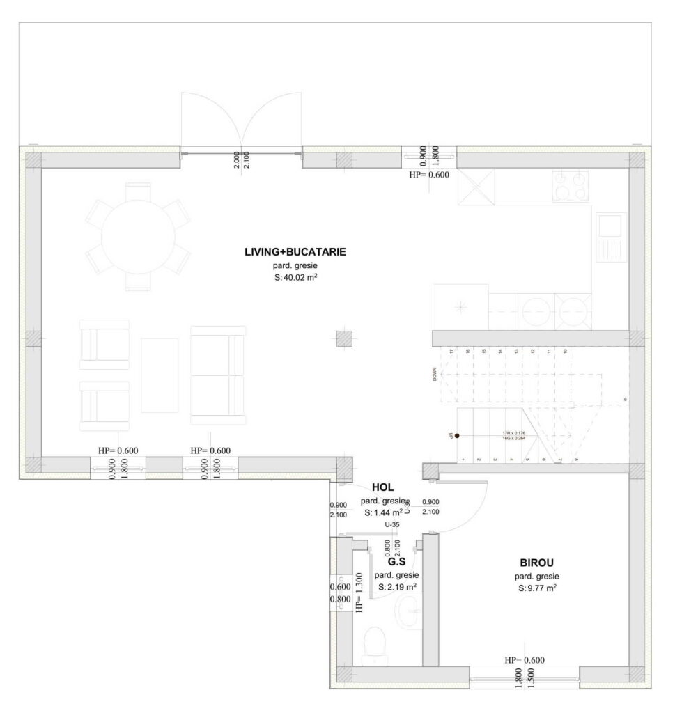 Totuși, piesa principală a parterului este zona de open-space, în suprafață de 40,02 mp utili, care reunește bucătăria spațioasă, dispusă în formă de U pentru a optimiza cât mai bine spațiul disponibil, zona de dining și zona de relaxare. Să nu uităm de faptul că toată această zonă este foarte bine iluminată, având suprafețe vitrate generoase.