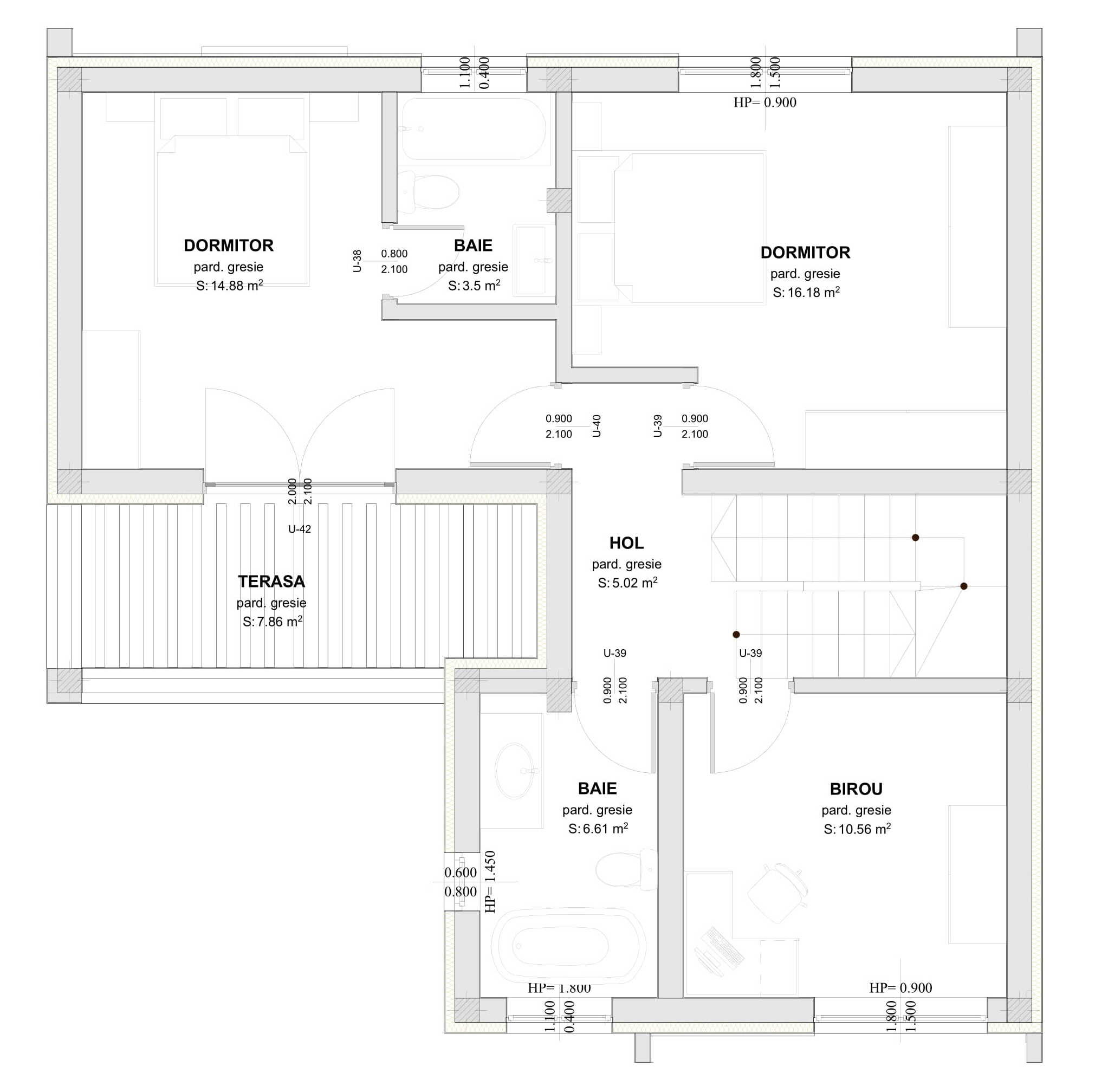 Totuși, piesa principală a parterului este zona de open-space, în suprafață de 40,02 mp utili, care reunește bucătăria spațioasă, dispusă în formă de U pentru a optimiza cât mai bine spațiul disponibil, zona de dining și zona de relaxare. Să nu uităm de faptul că toată această zonă este foarte bine iluminată, având suprafețe vitrate generoase.