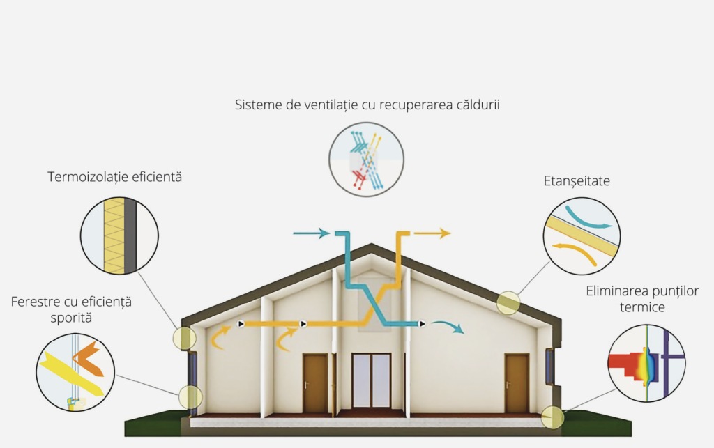 Pe lângă celelalte beneficii incluse în pachetul Premium – încălzire în pardoseală și pompă de căldură aer-apă – adăugăm la acest pachet 5 kWp panouri fotovoltaice și sistem de ventilație cu recuperare de căldură.